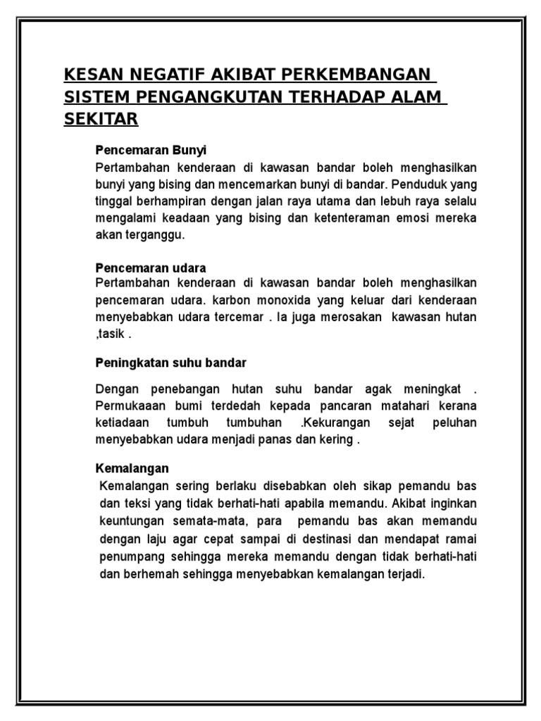 Pergantungan yang tinggi terhadap kenderaan persendirian seperti motosikal dan kereta akan memberi implikasi yang. Contoh masalah sistem pengangkutan awam di malaysia iaitu jalan raya darat, mengenal pasti & senarai faktor serta cadangan bagi kerja. I su d an m asalah pengangkutan di tam an berangan,sungai petani. Pengangkutan awam seperti lrt (light rail transit) dan komuter menggunakan landasan yang teratur masa dan perjalanannya berbanding. Saat ini di indonesia terdapat banyak bentuk badan usaha baik yang bersifat persekutuan, perseroan, badan hukum seperti perusahaan dagang (pd), comanditter vennootschap (cv), firma, persekutuan.