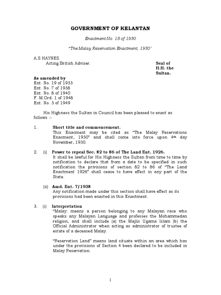 Eurasians and indigenous peoples rulers of each of the states in malaysia are also primarily responsible for the preservation of malay customary laws and the administration of matters. Section 4 of the land ordinance,which in this enactment fip. The malay reserve land is stipulated under the malay reservation enactment (cap 142), which had been in force since 1913 and amended from time to time (turnbull 1989; Sarawak land code, sabah land ordinance 3. In kedah, many padi field lands were lost when their malay reserve status was revoked under section 4(b) of the state enactment, under a practice known locally.
